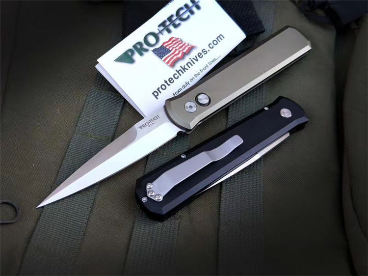 PROTECH超技术920跳刀 品牌:超技术 货号:920教父 类型:侧跳刀 全长:235mm 刃钢:154-CM深冷热处理 表面:精抛光拉丝刀刃 硬度:59-60HRC 刃厚:3.2mm 刃长:10mm 柄长:135mm 柄材及处理:6061-T6太空铝,全CNC加工 重量:约110g 喷砂背夹,彩盒包装