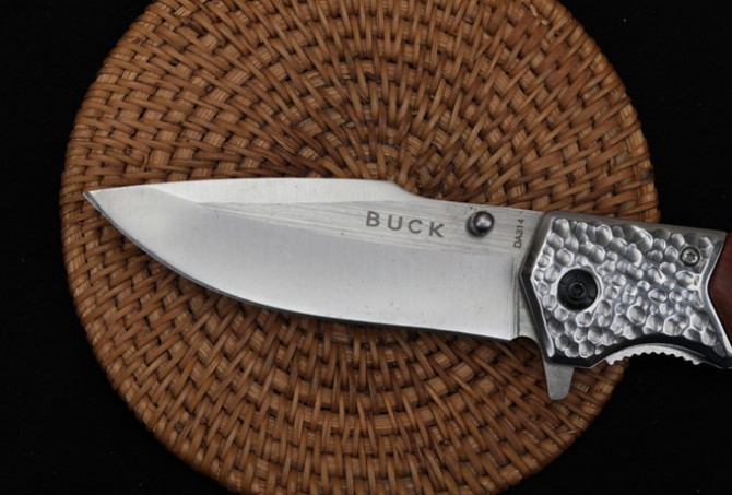 巴克DA314快开折刀 全长:22.3cm 刃长:9.1cm 柄长:11.6cm 刃宽:2.9mm 刃厚:0.28mm 刃材:440C 重量:174g(含包装物) 硬度:58HRC 表面:灰钛真空镀钛处理 柄材:钢+酸枝木 锁型:线锁 其他:配彩盒