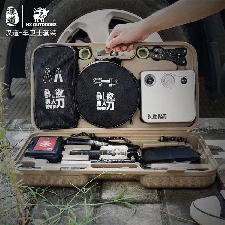 汉道车卫士套装 为自驾越野而生,汉道车卫士套装配备充气泵,拖车绳,汽车电瓶搭火线,守护者多功能铲,电筒,生存刀,纱布剪,反光条,急救包,钳子配件,多功能钳,组成一套完整的车载工具套装。使用便携手提箱收纳,携带方便;功能全面,车载应急,务实好用