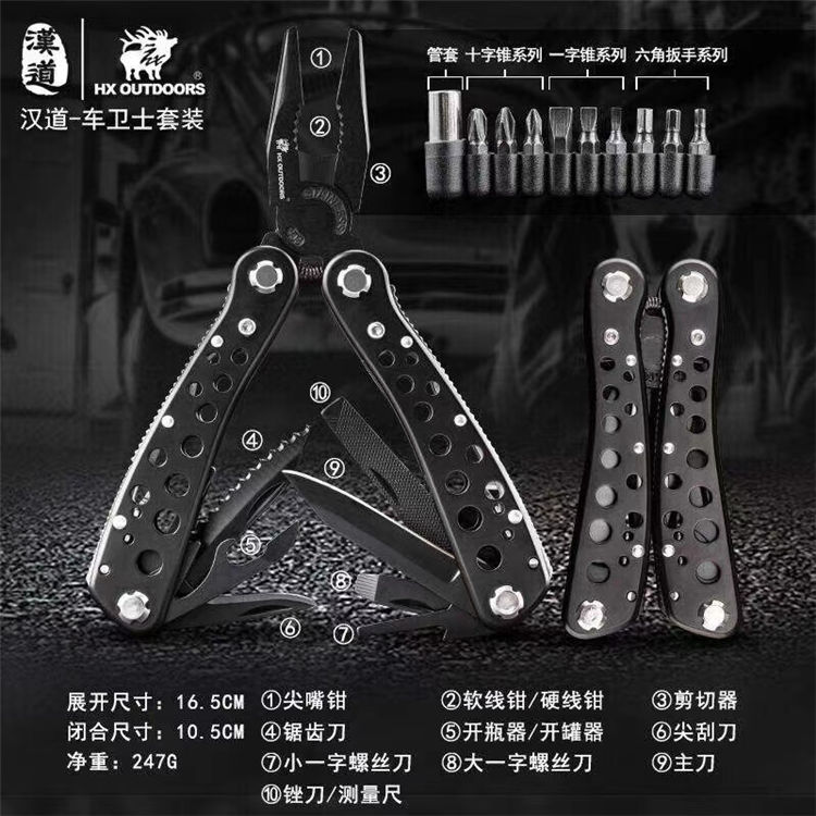 为自驾越野而生,汉道车卫士套装配备充气泵,拖车绳,汽车电瓶搭火线,守护者多功能铲,电筒,生存刀,纱布剪,反光条,急救包,钳子配件,多功能钳,组成一套完整的车载工具套装。使用便携手提箱收纳,携带方便;功能全面,车载应急,务实好用