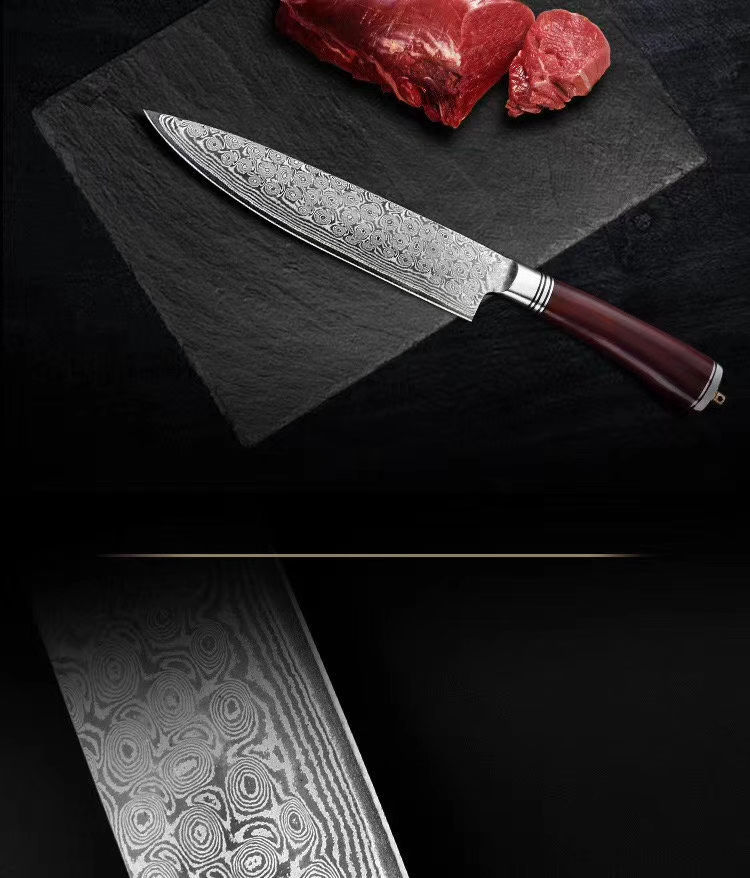 大马士革8寸厨刀 总长:33.5cm 刃长:9cm 柄长:14cm 刃宽:4.3cm 厚度:2mm 钢材:大马士革钢 柄材:科檀木