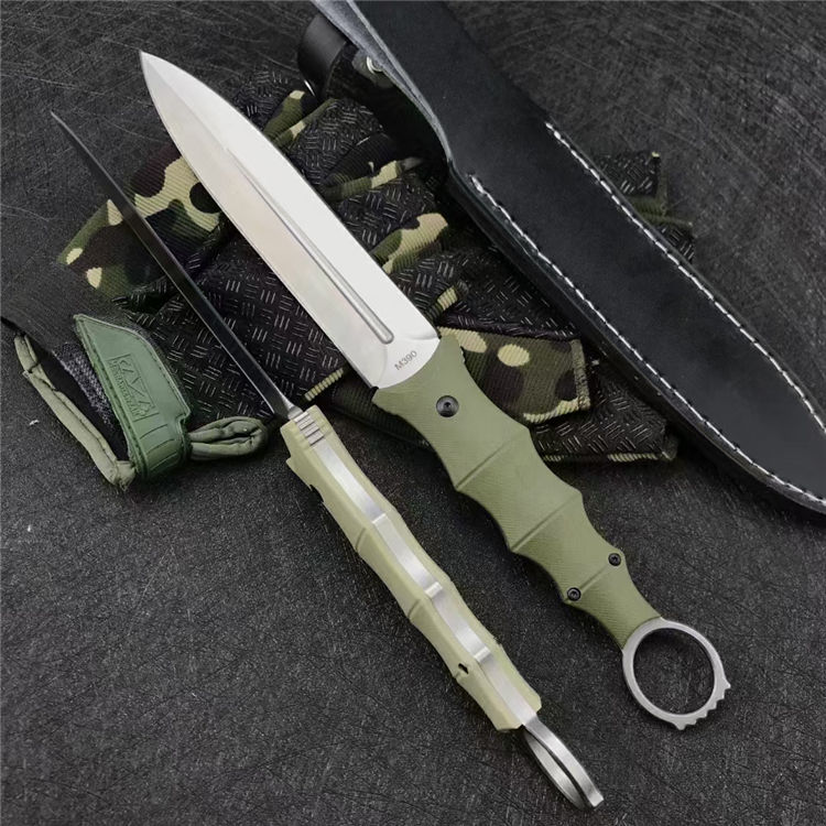毒液双刃刺刀 全长:29.5CM 刃长:16CM 厚:0.5CM 刃宽:3CM 刃材:M-390 硬度:60(真空油冷热处理) 战术牛皮,刀套牛皮挂件