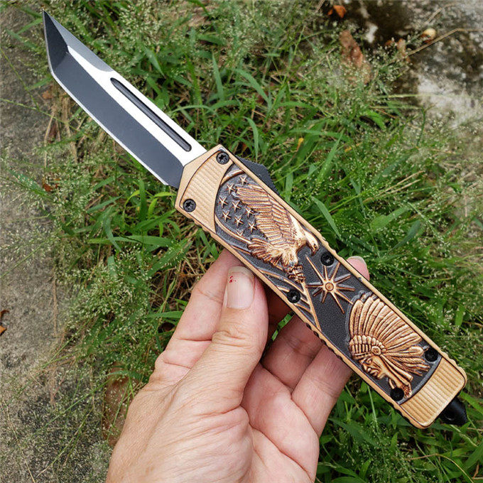 印第安猎鹰直出跳刀 开启长度:23.0CM 合起长度:14.CM 刃长:9cm 刃厚:2.9CM 硬度:57HRC 刃材:440 表面:刀刃发黑伴拉丝 把手:锌铝合金 净重:231克(整刀) 毛重:450克(含包装物) 开合:双动作,直推开关,自动弹出和收回 包装:耐磨专用战术尼龙套 口袋刀夹:弹簧刀夹 玻璃敲击器:钨质玻璃敲击器