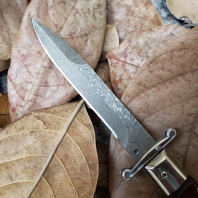 大马士革意大利守护神侧开跳刀 全长:22.86CM 刃长:10CM 刃厚:3MM 刃材:大马士革 柄材:全钢+蛇纹木 重量:120克 包装:礼盒