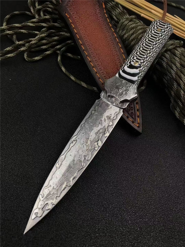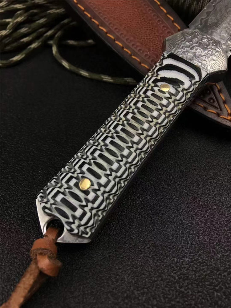 大马士革虎牙直刀 全长:24.5cm 刃长:12.5cm 刃宽:2.7cm(最宽处) 柄长:12cm 刃材:进口锻造大马士革钢 硬度:60-61HRC 热 处理:真空高温热处理 柄材:G10高硬度纤维。经电脑锣精加工防滑格纹 重量:187克(含套) 刀套:阿根廷进口植鞣皮手工制作刀套高端珍藏品