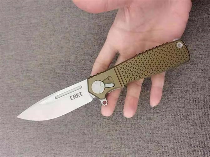 CRKT家园防线折刀 刃材:山特维克12C27 柄材:铝合金 全长:21.5cm 刃长:9.3cm 闭合:12.5cm 刃厚:3.98mm 表面处理:石洗 硬度:59-60HRC 净重:160克 备注:折刀裸手可拆开