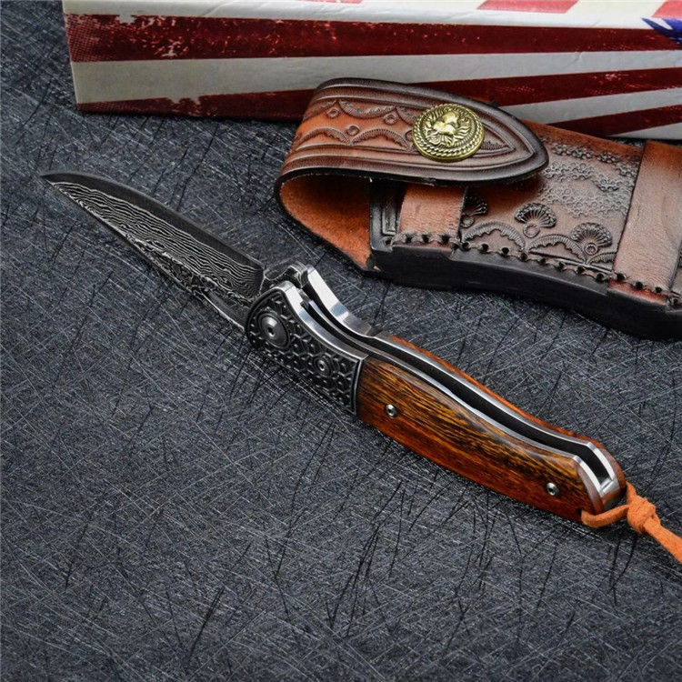 大马士革乱战折刀 总长:19.7cm 刃长:8.5cm 闭合:11cm 刃厚:0.28cm 刃宽:2.7cm 净重:133g 毛重:237g(刀+套+盒) 钢材:进口VG10大马士革钢 硬度:60-61HRC 柄材:3D精雕440C钢头+进口沙漠铁木 皮套:意大利植鞣皮纯手工制作,手工缝线着色皮套 包装:黑色手工盒子