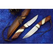 DC53猎鱼直刀 总长:20.6cm 刃长:9.2cm 刃厚:3.5MM 刃宽:2.4cm 钢材:进口DC53合金模具钢 硬度:61-62HRC 热处理:真空热处理 表面效果:精细砂光+拉丝 柄材:黄铜+黄檀木 皮套;意大利进口植鞣皮,手工复棕色雕花皮套
