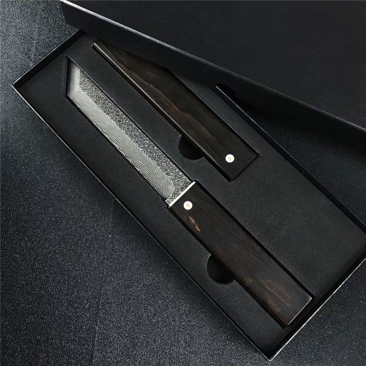 大马士革黑刃黑旋风直刀 全长:261mm 刃长:140mm 柄长:114mm 钢材:VG10大马士革 柄材:黑檀木 刀厚:3.8mm 刃宽:24.5mm 硬度:60-61HRC 表面处理:黑色原色 净重:162g 毛重:约345G(包含盒子和刀套) 包装:黑色礼品盒