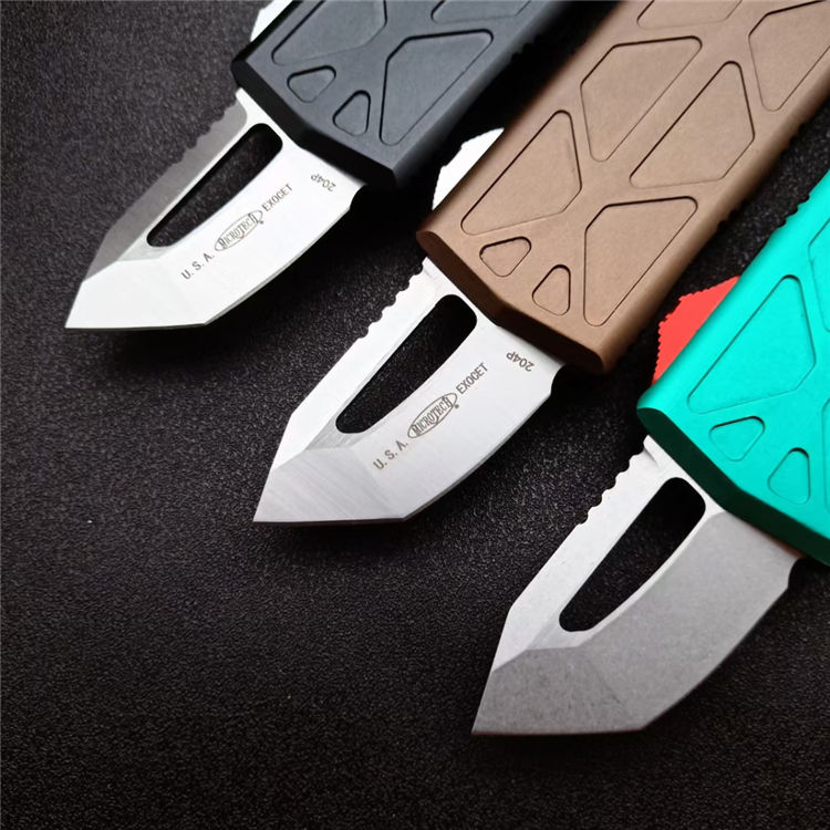 微技术T版飞鱼直出跳刀 全长:14.4cm 刃长:5cm 柄长:9.4cm 刀厚:2mm 刃宽:27.5mm 刀刃:D2 手柄:T6-6061航空铝合金 硬度:58-59 HRC 净重:94克 包装:盒子