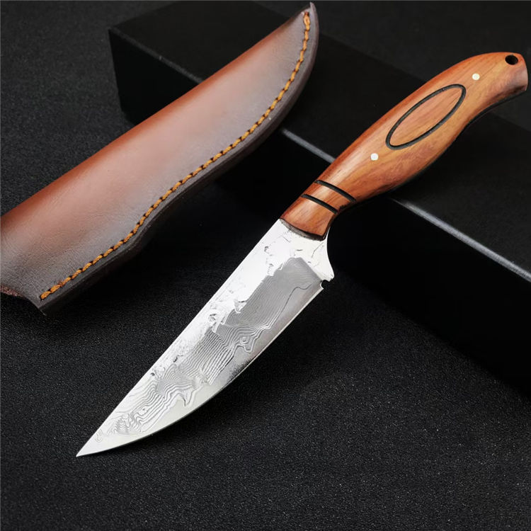大马士革丹顶鹤猎刀 全长:21.8CM 刃长:11.2CM 刃宽:2.8CM 刃材:折叠锻打大马士革钢 刃厚:4MM 柄长:10.7CM 柄材:天然酸枝木 重量:313G 刀鞘:牛皮鞘