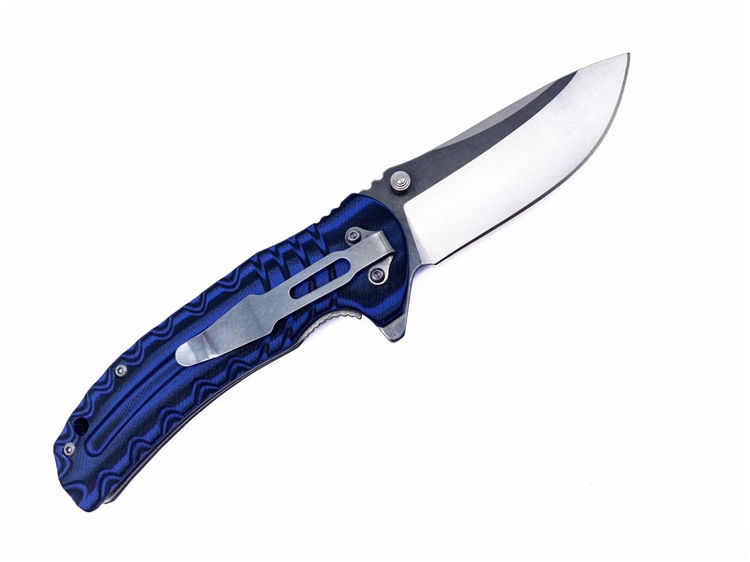 外贸赫伯茨折刀 总长:19.8cm 刃长:8.2cm 柄长:11.5cm 厚度:0.31mm 刃宽:2.9cm 表面处理:石洗 硬度:58HRC 净重:155g 材质:9CR14 内置轴承滚珠系统 柄材:双色G10 其他:配成型尼 龙套:彩盒色装