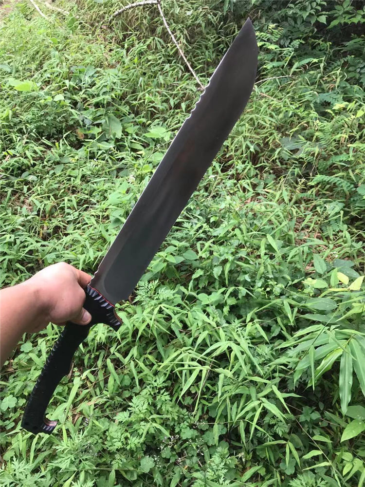 野牛双手屠龙开山刀 全长:670mm 刃长:400mm 刃宽:59mm 柄长:270mm 刃厚:6.0mm 材质:DC53(经过暴力测试。热处理性能成熟稳定) 硬度:59 表面处理:精磨钢本 手柄:龙骨黑色G10 刀身:CNC精工+数控V磨 刀鞘:美产进口2.0K鞘