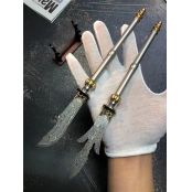 大马士革小关刀/三叉戟迷你版 总长:24cm 刃长:9cm 柄长:16cm 刃宽:2cm 厚度:2.5mm 钢材:进口锻造大马士革钢(68层)祥云纹理 表面:原大马士革花纹 硬度:60HRC 柄材:不锈钢档手+纯黄铜轴承结构+钛合金手柄 包装:高级手工木盒+手工小刀架 镇店镇宅小宝物,家居办公摆设,具有招财辟邪作用,勇猛威武谁敢当,斜影跨下云中月,青龙刀盖世无双,国内知名大师制作