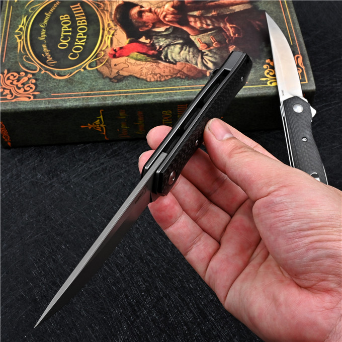 M390博克BOKER必杀折刀 全长:21.3cm 刃长:8.7cm 柄长:12.3cm 刃厚:0.3cm 刃宽:2.1cm 刃材:M390 柄材:碳纤维 硬度:60-61HRC 表面处理:砂光或镀钛 净重:110g