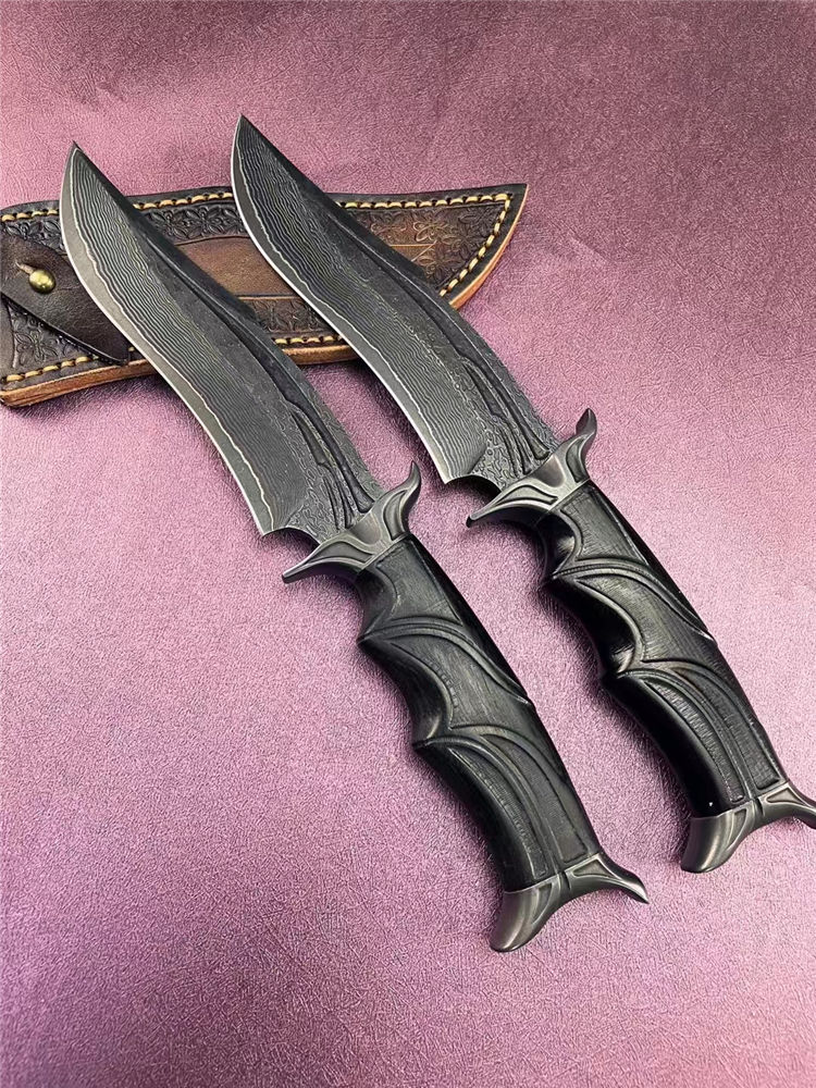 大马士革暗黑夜行者直刀 总长:28cm 刃长:15cm 刃厚:4MM 刃材:67层锻造大马士革夹钢,表面沧桑复古效果 硬度:60HRC,真空热处理 开刃方式:手工二次开刃 柄材:石洗钢护手+原只黑檀木 包装:手工皮套+手工黑盒