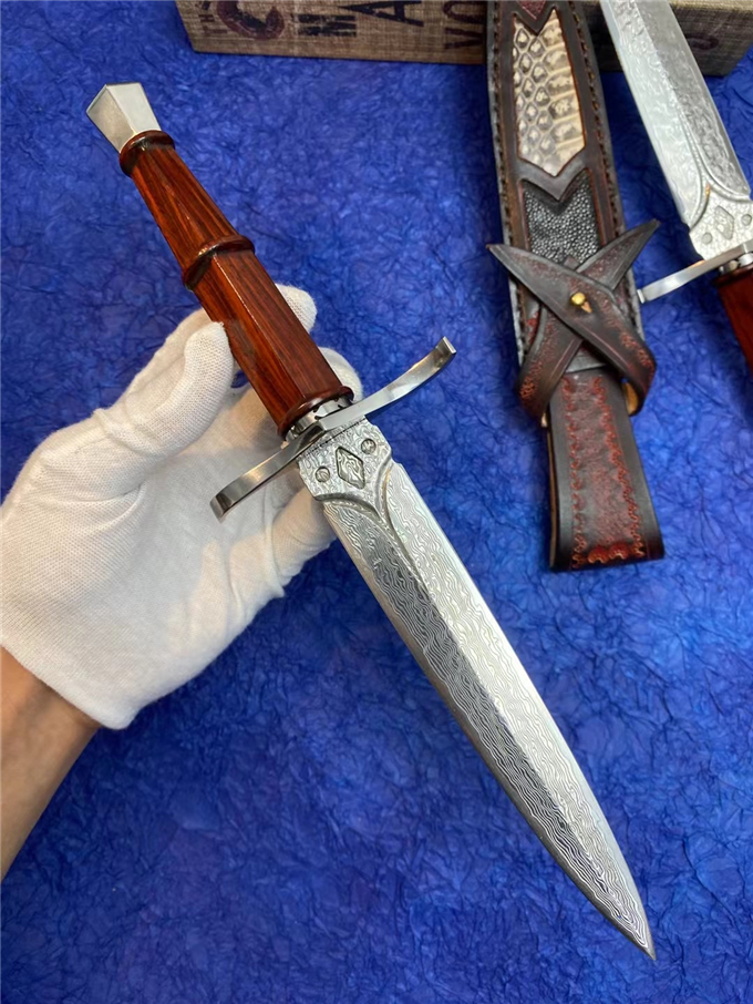 大马士革罗马神剑直刀 总长:28cm刀刃:14.5cm手柄:12cm刃宽:2.5cm厚度:3MM刃材:进口锻造大马士革钢硬度:60HRC手柄:微粒黄檀木皮套:进口植鞣皮镶嵌蛇皮+珍珠鱼皮刀套