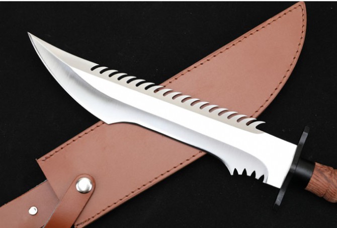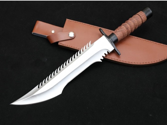 联合刀具蛟龙直刀 全长:41.3cm 刃长:27.5cm 柄长:13.5cm 刃厚:0.55cm 刃宽:5.3cm 刃材:8CR15MOV 柄材:钢头护手+防滑酸枝木柄,刀背带齿 硬度:57HRC 净重:780克 总重:616克(含包装) 刀身:一体龙骨 表面处:沙光 其它:复合皮套