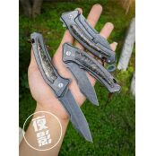 大马士革夜影折刀 总长:19.5cm 刀刃:8.5cm 折合:11.5cm 刃宽:2.3cm 刃厚:3MM 刃材:进口锻造大马士革钢 热处理:真空热处理 硬度:60HRC 结构:滚珠轴承快开 柄材:进口大马士革钢+金粉碳纤 包装:黑色硬小礼盒