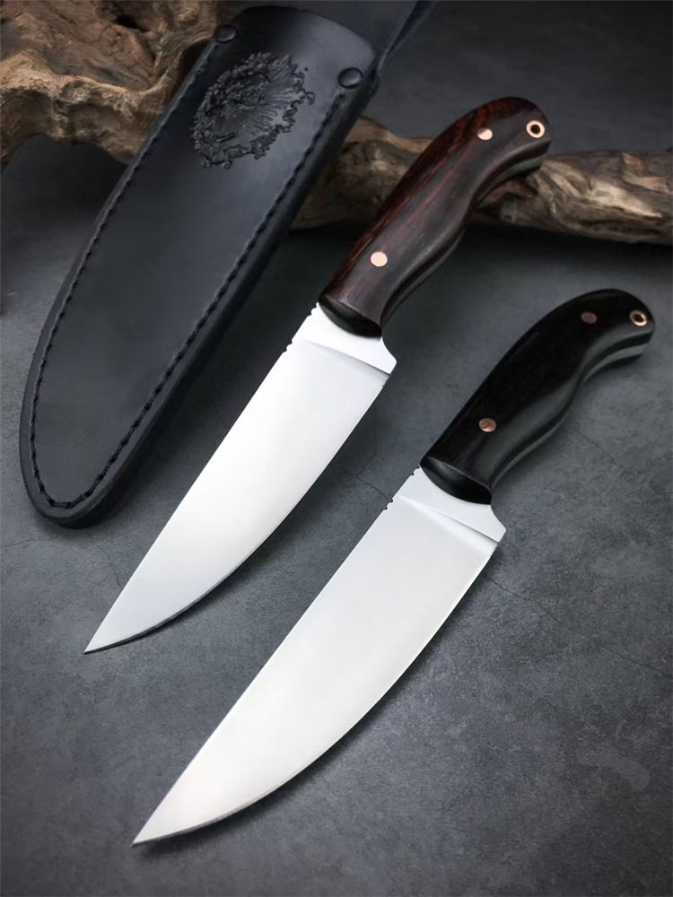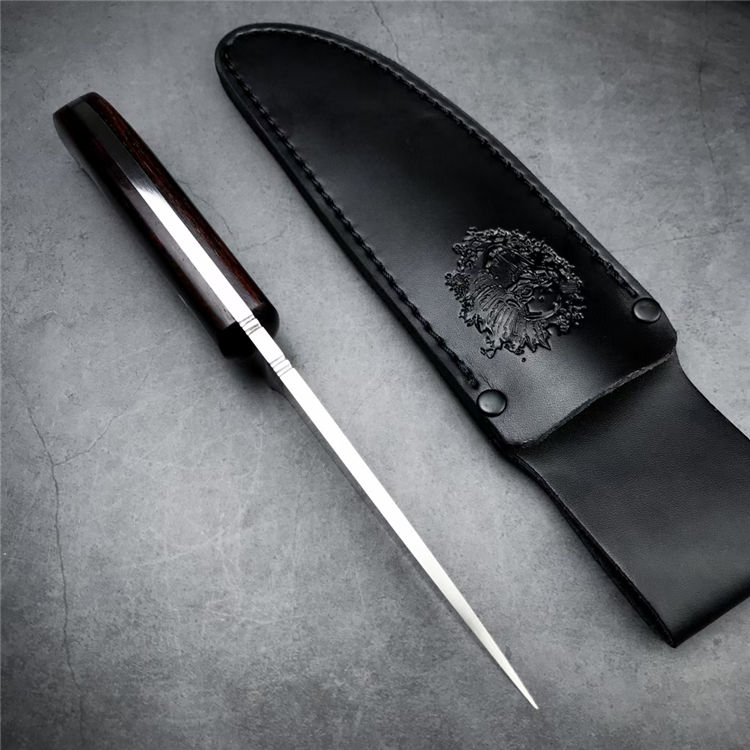 复刻版美国温克勒直刀 总长:235mm 刃长:115mm 柄长:120mm 钢材:DC53钢 硬度:60RHC 开刃:二次开刃,以锋利度为主 柄材:两种黑檀木和黄檀木柄材+铜钉 手柄:AB胶加固 刀鞘:牛皮鞘
