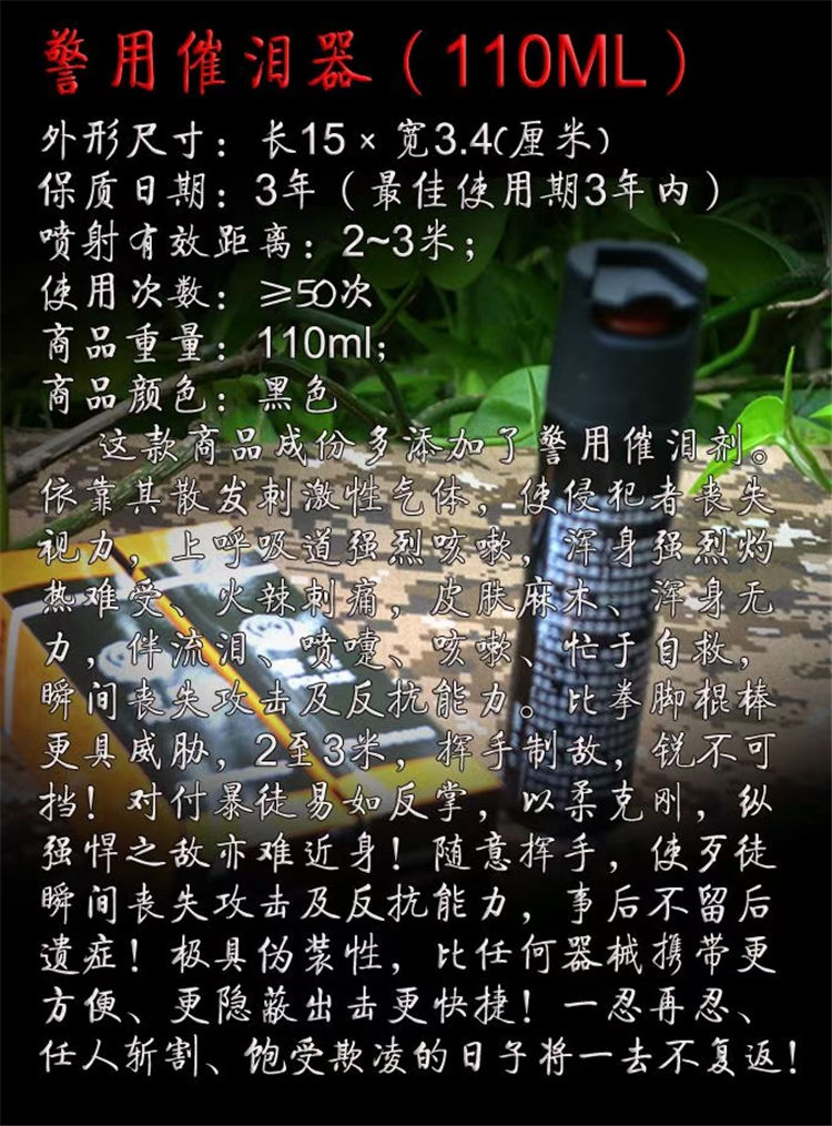 特别提示:此产品在目前市场上同类产品中其效果与精致度当属第一,由此引得不少厂家假冒,其主要特点是:其金属挂与正品不一样,比较粗糙一点,其次产品外观非常容易掉漆,刚拿到手上可能已经掉了一部分了,而正品要经过相当长时间的磨损其表面才会慢慢掉漆.另外次品的重量也没有正品的重,而效果更是大打折扣:喷出的是水,而不是雾.而正品喷出的是白色的雾状气体!俗称防狼喷雾、制暴喷雾等。¢35*110毫米,110毫升.在国外防暴中普遍装备,它的特点是——立刻制止对方的所有动作,被喷到的人双目失明,喷嚏咳嗽不停,呼吸道如同火烧,难受至极点,无论对方有多厉害,都无法抵挡其威力,但是它又不会造成任何伤害,为你免去所有法律麻烦 。