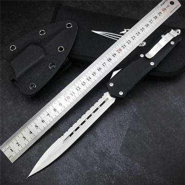 微技术毒液直出跳刀 全长:28cm 刃长:14cm 刃厚:2.8mm 刃材:440c 硬度:59HRC 刀重:240g 毛重:360g 表面:喷砂 镀钛 柄材:锌铝合金 刀鞘:k鞘