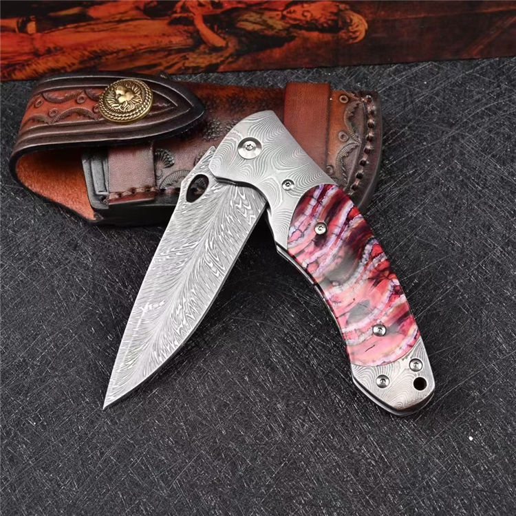 大马士革羽毛蚊钢非凡折刀 总长:20cm 折合:11.5cm 刃长:9cm 刃厚:3.1mm 刃宽:2.7cm 钢材:俄罗斯进口羽毛蚊钢 硬度:60-61HRC,真空热处理 开刃方式:二次开刃 柄材:大马士革+天然猛犸齿料制作 结构:陶瓷轴承滚珠 包装:手工黑小盒装
