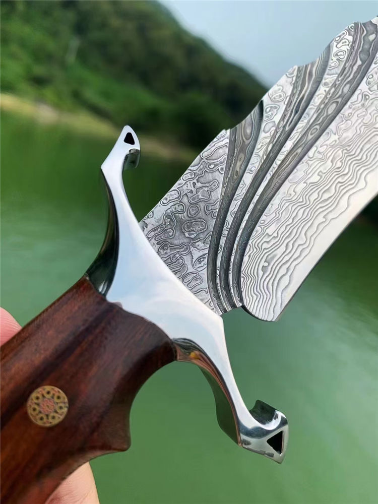 大马士革惊鸿博弈直刀 总长:28cm 刃长:16cm 柄长:12cm 刃厚:4MM 刃宽:3.5cm 刃材:VG10大马士革钢、真空热处理 硬度:60HRC 柄材:镜面钢头+美国沙铁木 包装:手工皮套+骷髅吊坠
