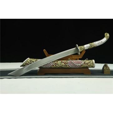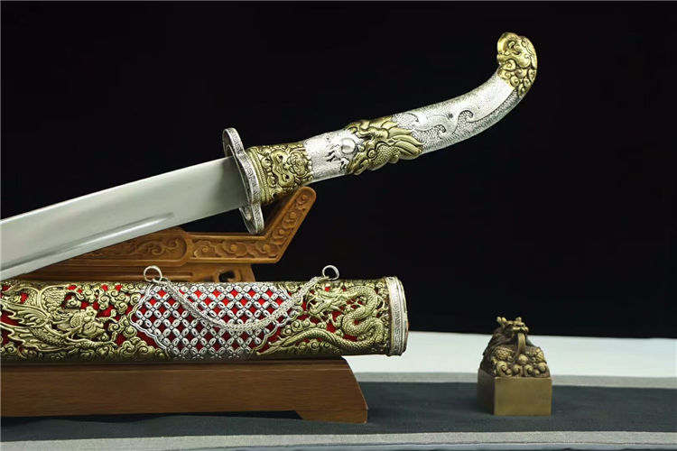 雪域龙凤藏刀 全长:87cm 柄长:30cm 刃长:55cm 刃厚:4.5-4.7cm 全重:2.15公斤 刀重:1.4公斤 鞘材:全铜鎏金银 柄材:全铜鎏金银 刃材:手工锻打弹簧钢 硬度:60hrc 赠品:精美锦盒