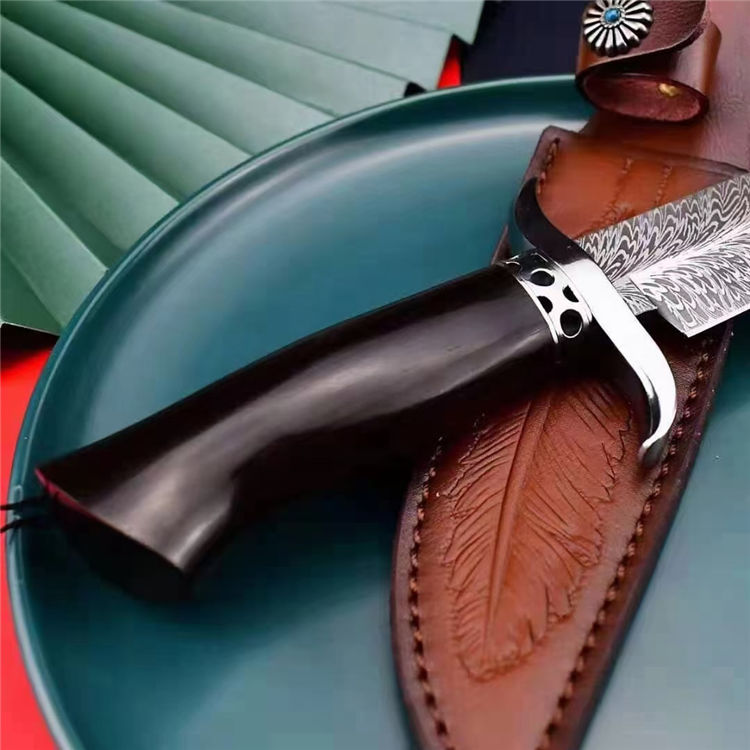 复古时尚,手工纯手工制作,搭配真牛皮套,9Cr15Mov刀刃表面腐蚀羽毛纹,非常漂亮耐看,原条黑檀木手柄,做工细节很好