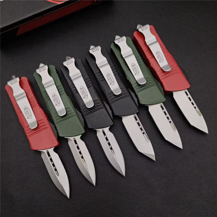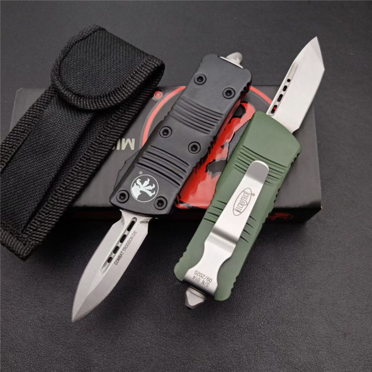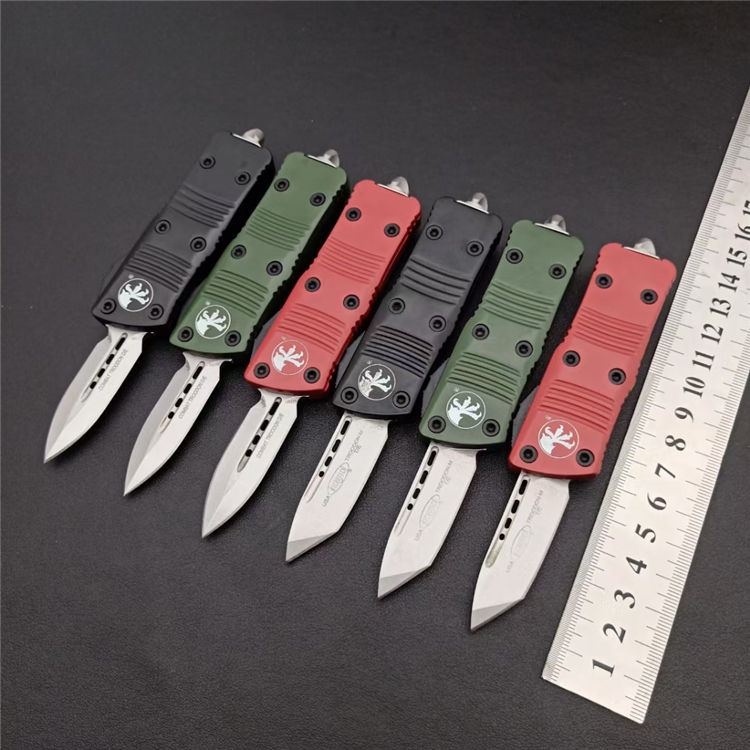 微技术经济版迷你龙直出跳刀 全长:138mm 刃长:48mm 闭合:90mm 刃宽:16mm 刃厚:3mm 刃材:9CR18 硬度:58-59HRC 柄材:锌铝合金 柄厚:101mm 螺丝:数控电脑锣 净重:110g 毛重:142g 包装:尼龙套+彩色纸盒