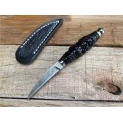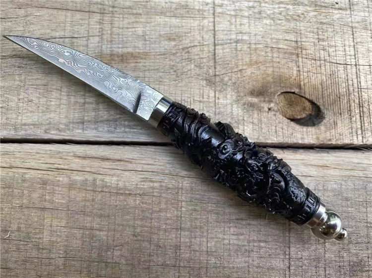 大马士革雕龙爪刀 总长:14.5cm 刃长:6.cm 刃厚:2.5mm 钢材:大马士革钢 硬度:59HRC 表面:大马士革原纹 柄材:精选檀木精雕龙 包装:高级礼品硬盒