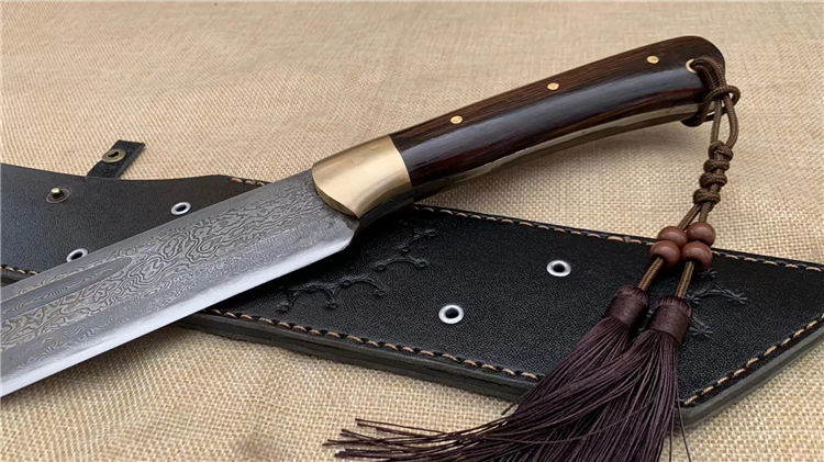 户撒刀高端开山刀 全长:52cm 刀长:36cm 把长:16cm 刀宽:5.5cm 刃厚:0.8cm 刀把龙骨一体刀身为百炼折花手工锻打此刀钢火好,手感好,又大气