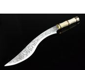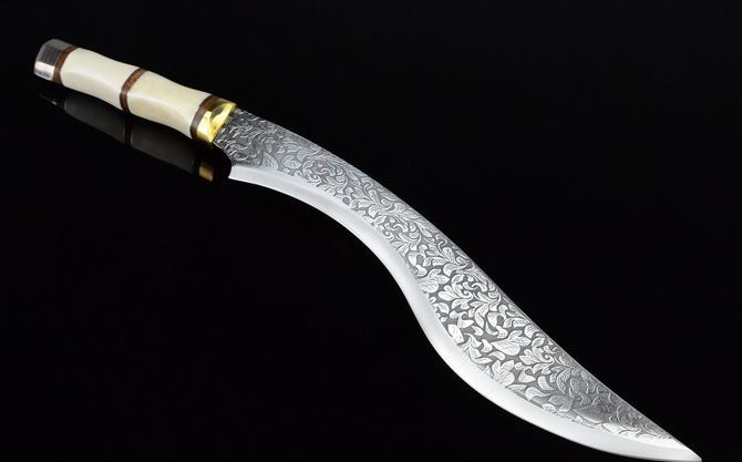 月牙扎花弯刀 全 长: 60.8cm 刃 长: 40.3cm 刃 厚: 4.7mm 刃 宽: 6.6cm(最宽处) 刃 材: 420 硬 度: 57HRC 刀 重: 2260克(含包装) 表 面: 扎花 柄 材: 铜+钢+皮+野骨 结 构: 一体龙骨 刀 鞘: 牛皮