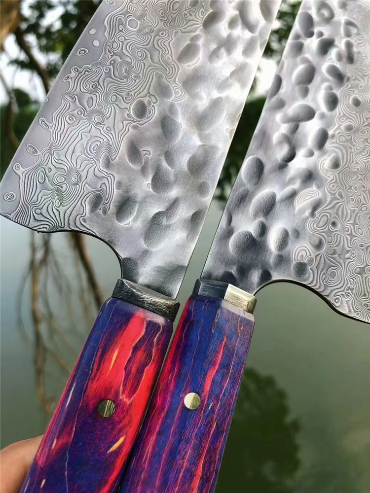 简师傅幻影小菜刀 总长:24.5cm 刀片:13.5cm 手柄:10.3cm 厚度:2.9MM 宽度:6cm 材质:进口锻造大马士革钢 硬度:60HRC 柄材:进口固化稳定木材 重量:170g(净重) 包装:礼品手工盒