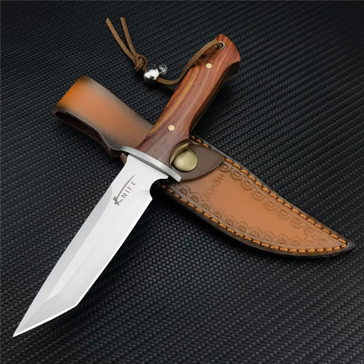 翼虎直刀 全长:19.2CM 刃长:10.2CM 刃宽:2.2CM 刃厚:3MM 刃材:7Cr13Mov 柄长:9CM 柄材:橄榄木染黑与红花梨木 净重:112G 重量:141G(含刀套) 鞘材:PU皮鞘