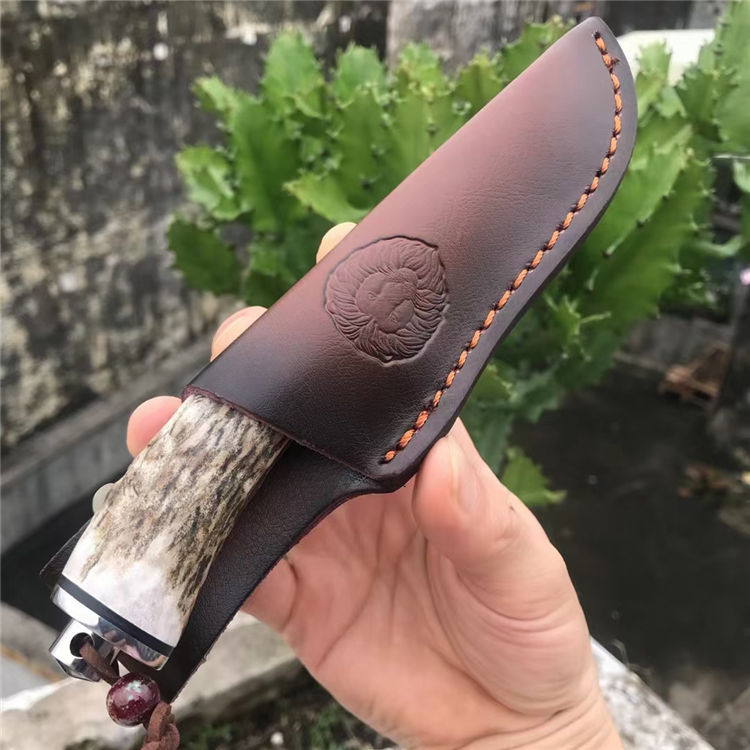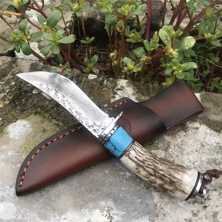 大马士革蓝月亮直刀 全长:18.5cm 刃长: 8.9cm 柄长: 9.6cm 刃宽:2.3cm (最宽处) 刃厚:0.35cm 硬度:59-60HRC 重量: 约180克(含包装) 表面:锻打大马士革雨滴祥云纹原色 刃材:Vg10大马士革钢 柄材:天然鹿角+蓝松石+不锈钢 配送:高档手工皮套+精美礼品盒+牛皮绳+彩珠子
