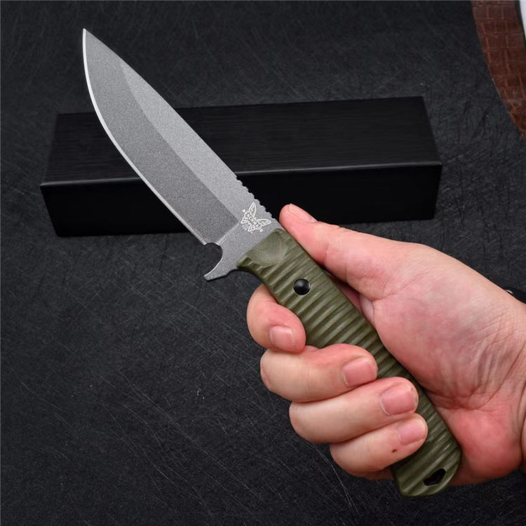 复刻版蝴蝶539GY直刀 全长:250mm 刃长:112mm 柄长:123mm 刃厚:4.2mm 刃宽:31mm 刀重:238g 毛重:434g 钢材:DC53钢 柄材:绿色G10 硬度:60-61HRC 表面处理:新工艺镀钛(不掉色) 刀鞘:Kydex鞘 包装:礼盒