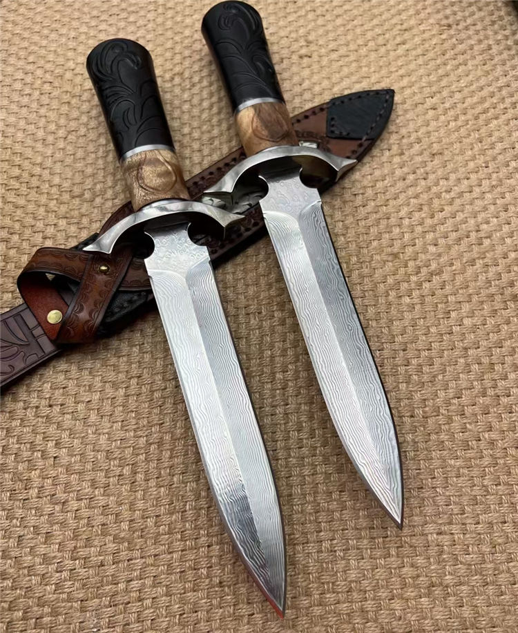 大马士革罗曼神剑直刀 总长:31cm 刃长:18.5cm 手柄:11.5cm 厚度:4mm 刃宽:3.2cm 钢材:进口锻造大马士革钢(乌波纹) 硬度:60-61HRC 皮套:意大利进口植鞣皮纯手工雕花镶嵌蛇皮 热处理:真空深冷高温热处理 柄材:304不锈钢头+进口影木+黑檀木 包装:高端手工木盒+皮套