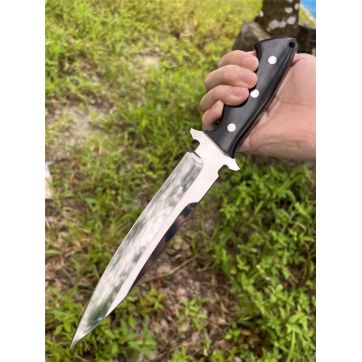 凤凰AUS-8直刀 总长:31cm 刃长:18cm 手柄:13cm 刃宽:3.6cm 厚度:4.5mm 材质:AUS-8钢 硬度:59-60HRC 柄材:黑檀木 皮套:进口植鞣革皮复古效果 包装:黑色盒 一体钢制作、数量不多,优惠性价比高,进口AUS-8高性能一体钢,表面镜面处理、高硬度真空热处理,黑檀木手柄握感超好的一款凤凰