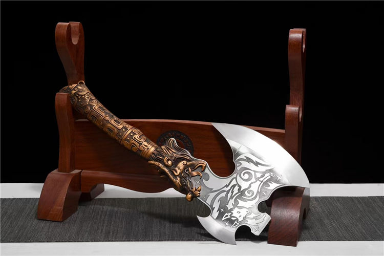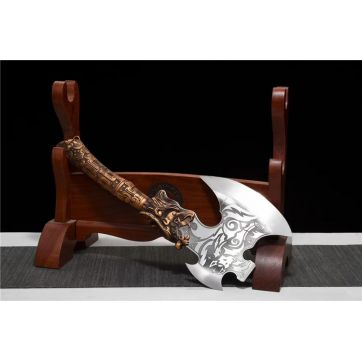 火狐战斧 全长:37.5cm 韧长:15.5cm 柄长:16cm 韧宽:16cm 刃厚:0.5cm 重量:1.04kg 手柄:咖啡色合金 斧刃:弹簧钢烙花