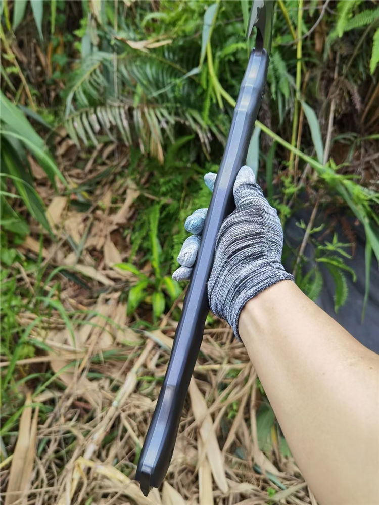 虎啸壬寅战歌斧头 全长:450mm 刃长:93mm 斧子宽度:168mm 柄长:395mm 刃厚:约7mm 刃材:Dc53 净重:1230g 硬度:59 手柄:g1012.9级锣丝 刀鞘:2.0mm美国进口k鞘 包装:快递飞机盒刃面cNc铣出造型刀背cNc铣出造型高精度控制Dc53真空热处理 刃面有两种:手工精细砂光蛤刃沧桑黑色火焰纹迷彩图层