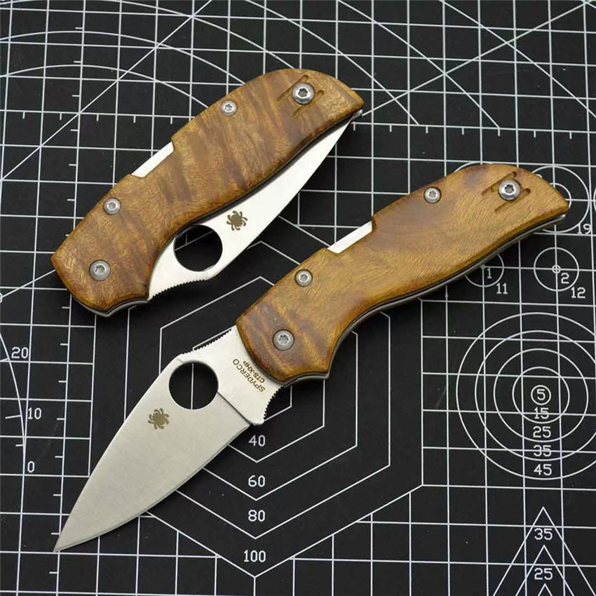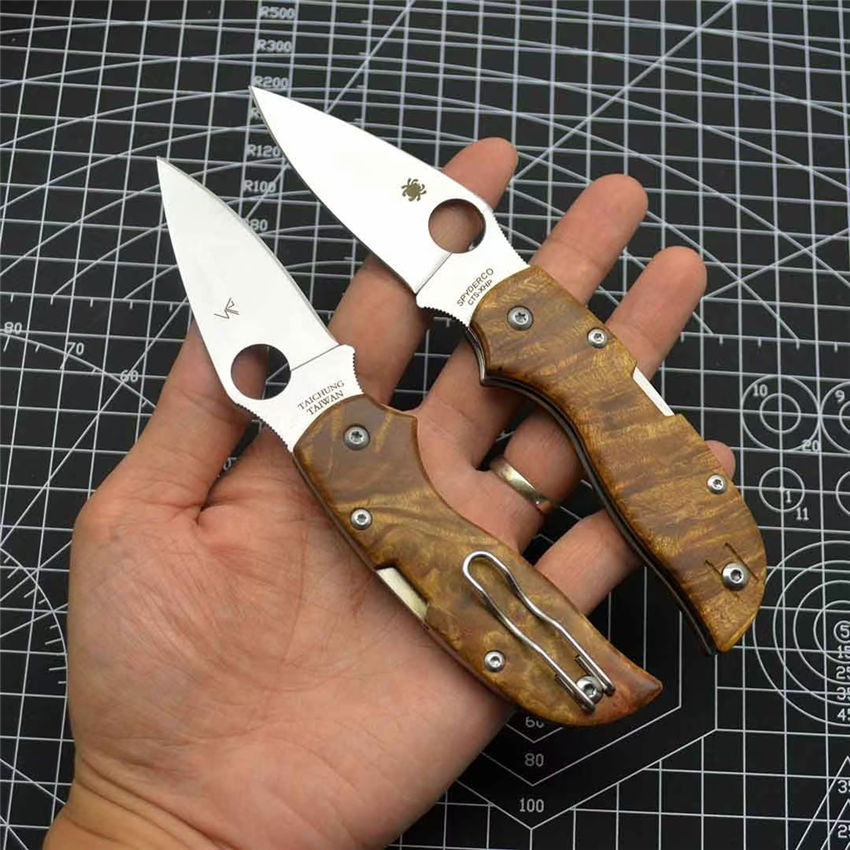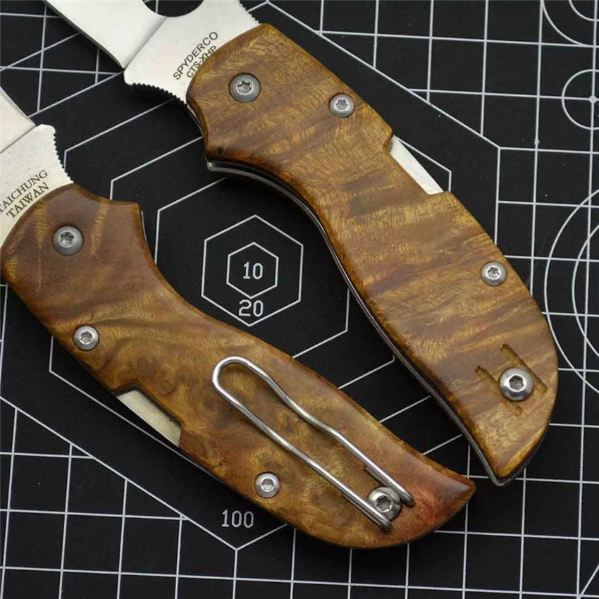 蜘蛛C152白影木折刀 全长:160mm 刃长:60mm 柄长:91mm 刃宽:26mm 刃厚:2.6mm 刃材:D2/大马士革钢 重量:83g 硬度:59HRC 表面:砂光 柄材:精细老料白影瘤木 其他:配彩盒