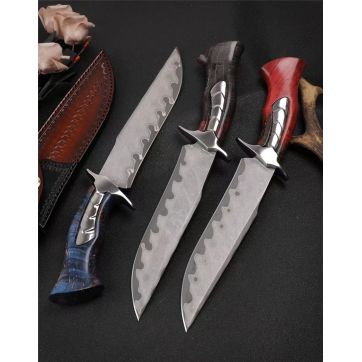 大马士革麒麟大博弈直刀 总长:37cm 刃长:24cm 手柄:13.5cm 刃宽:4.5MM 厚度:6MM 刃材:进口俄罗斯锻造大马士革钢 硬度:60-61HRC 柄材:一体不锈钢雕刻麒麟纹+七叶枫木固化木材 皮套:阿根廷进口植鞣革/手工制作高端皮套