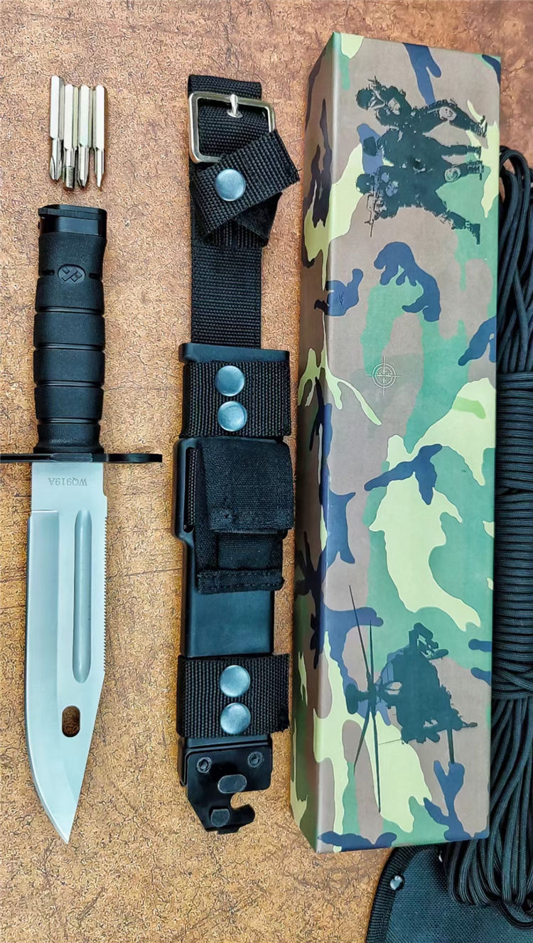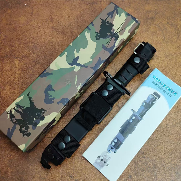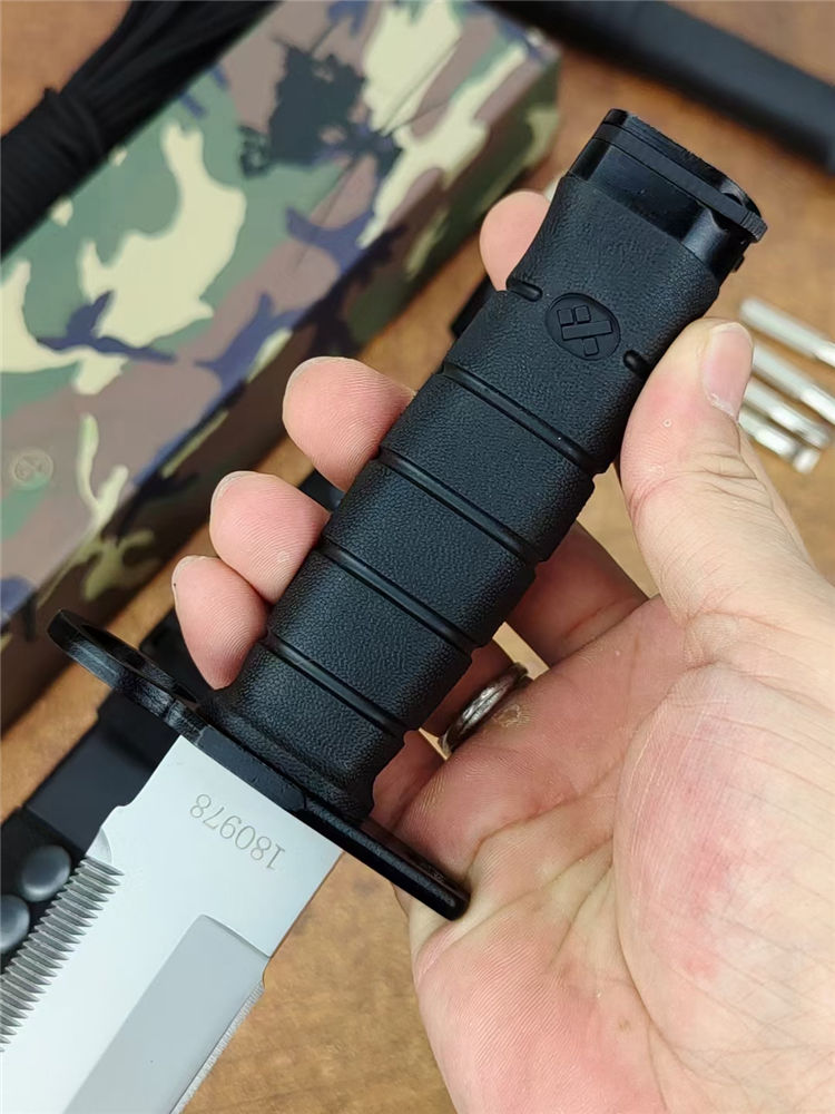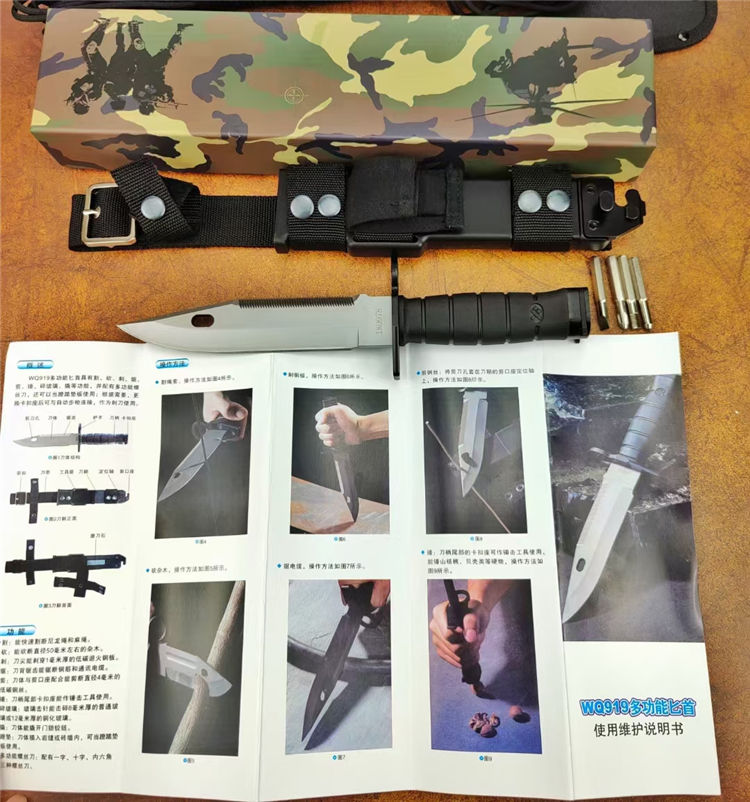 新品先锋M9军刺升级版多功能匕首具有割、砍、刺、锯、剪、锤、碎玻璃、磨刀石、撬等功能,并配有多功能呢螺丝刀,还可以当等踏板使用; 根据需要,更换卡扣座后可以与自动步Q连接,作为刺刀使用。M9式刺刀是在弗罗比斯公司的巴克马斯特狩猎刀的基础上改进而成的。刀身用不锈钢制造,经锻压加工,厚实坚固。表面呈银色。刃口部位经局部热处理,刀口锋利,能砍树枝木棒,切割绳索。刀背较长一段有锯齿,锯齿坚利,角度合适,能锯断飞机壳体和50.8mm厚的松木板。刀身前部有一长孔。表面有网状花纹,握持手感好。刺刀的横挡护手上有枪口环,刀柄尾部开一小卡槽。与枪的结合定位方法与M7式刺刀相同。