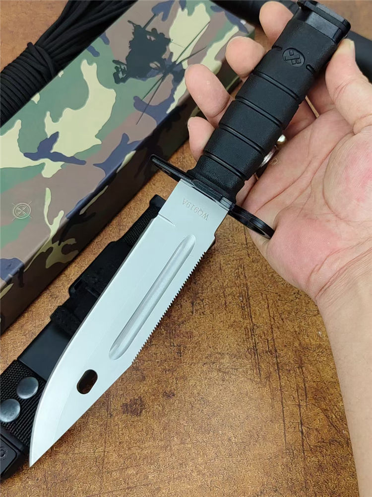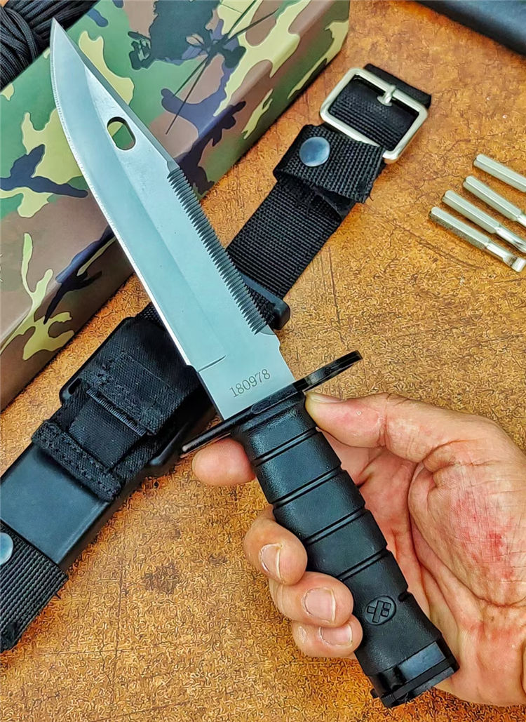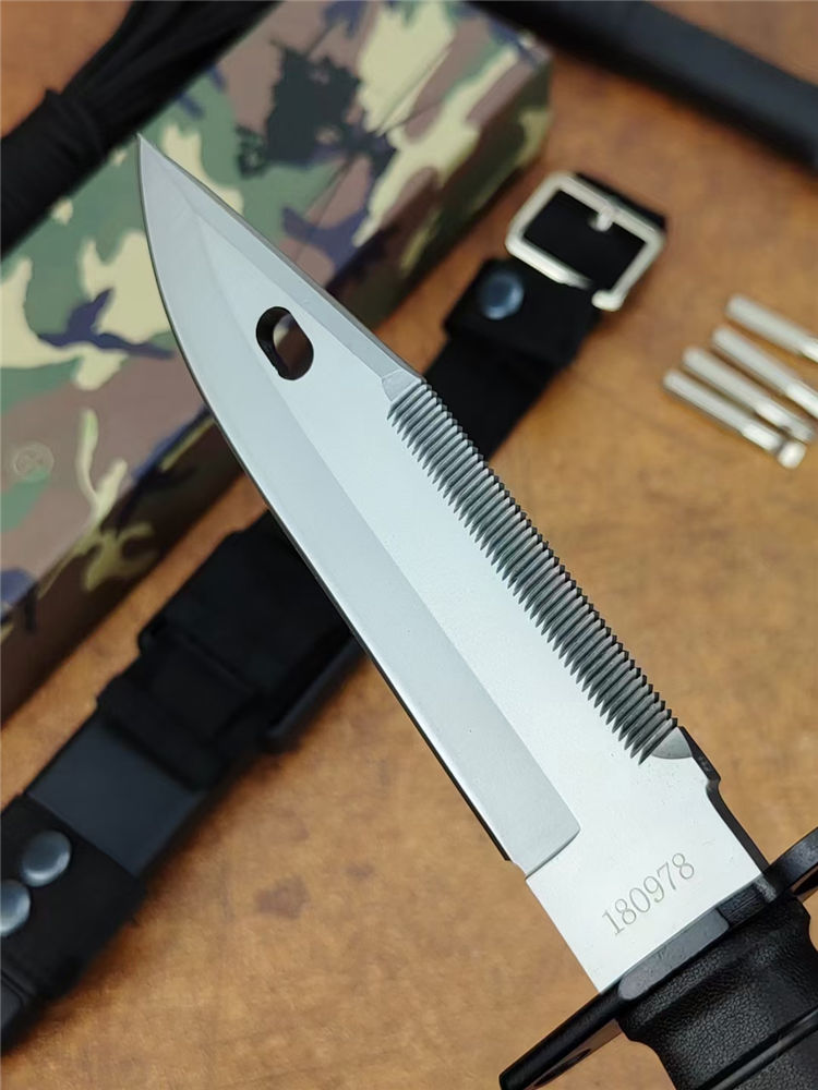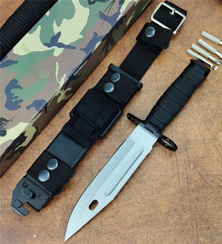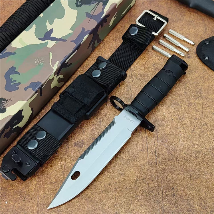 新品先锋M9军刺升级版多功能匕首具有割、砍、刺、锯、剪、锤、碎玻璃、磨刀石、撬等功能,并配有多功能呢螺丝刀,还可以当等踏板使用; 根据需要,更换卡扣座后可以与自动步Q连接,作为刺刀使用。M9式刺刀是在弗罗比斯公司的巴克马斯特狩猎刀的基础上改进而成的。刀身用不锈钢制造,经锻压加工,厚实坚固。表面呈银色。刃口部位经局部热处理,刀口锋利,能砍树枝木棒,切割绳索。刀背较长一段有锯齿,锯齿坚利,角度合适,能锯断飞机壳体和50.8mm厚的松木板。刀身前部有一长孔。表面有网状花纹,握持手感好。刺刀的横挡护手上有枪口环,刀柄尾部开一小卡槽。与枪的结合定位方法与M7式刺刀相同。