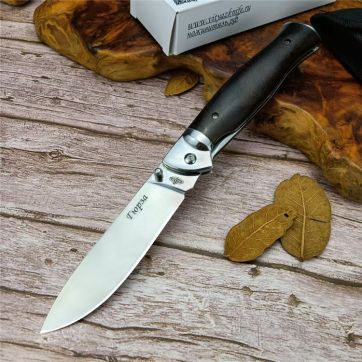 俄罗斯黑檀折刀 总长:24.2CM 刃长:10.4CM 刃宽:2.3CM 刃厚:2.5MM 刃材:440C 柄材:黑檀木 柄长:13.8CM 柄宽:25MM 柄厚:22MM 重量:175G