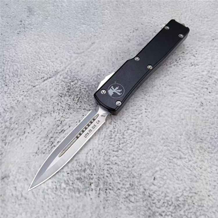 复刻版微技术UTX70直出跳刀 全长:148mm 刃长:61mm 闭合:87mm 刃厚:2mm 刃材:D2 柄材:航空铝 硬度:56-58HRC 净重:34g