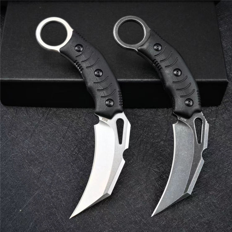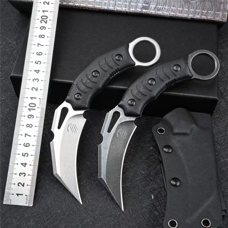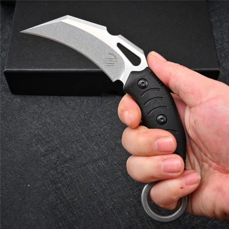 巴斯重型爪刀 全长:19cm 刃长:8.7cm 柄长:11.6cm 刃厚:0.46cm 刃宽:3.4cm 刀重:205g 毛重:439g 钢材:DC53 柄材:G10 硬度:60-61HRC 表面:石洗/黑色石洗 包装:礼盒 刀鞘:Kydex鞘