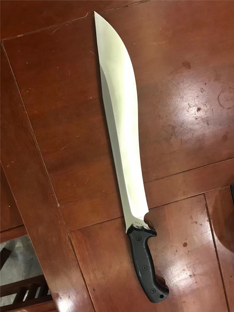野牛魔王砍刀 全长:465mm 刃长:303mm 刃宽:40-50mm 柄长:130mm 刃厚:6.5mm 刃材:DC53钢 热处理:真空油淬热处理 硬度:59HRC 表面:砂光钢本色 柄材:G10 刀体:CNC精细加工+数控V磨 刀鞘:2.0美产K鞘